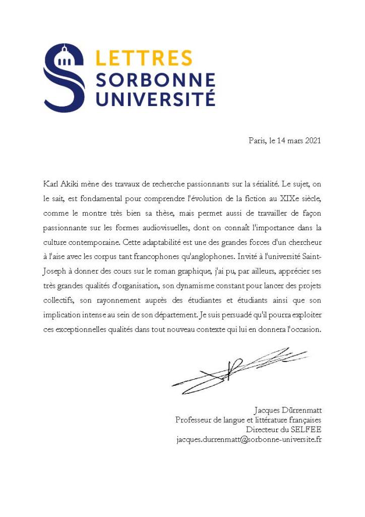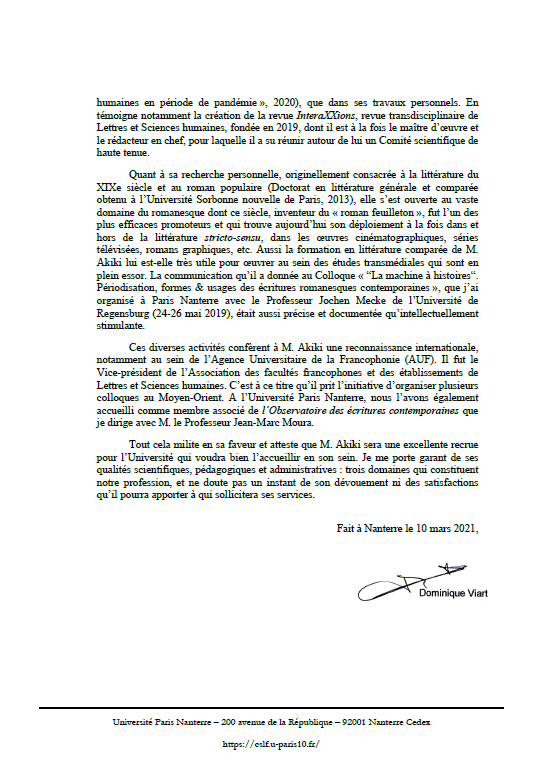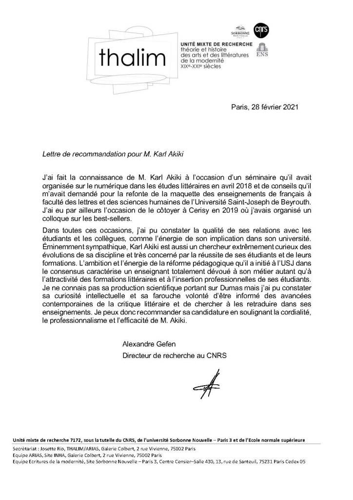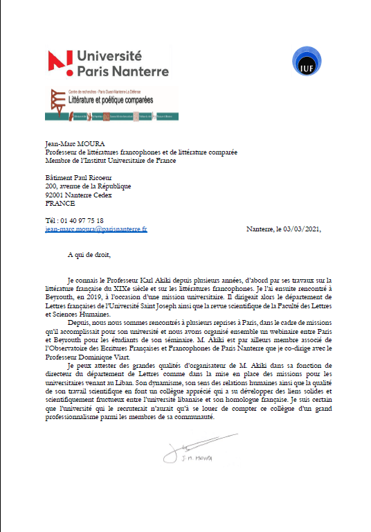 Entre le 1er septembre 2018 et le 1er septembre 2020, j’ai eu la chance de collaborer avec Monsieur Karl Akiki dans le cadre de mes fonctions de coordonnateur du département de littérature française au campus du Liban-Nord de l’Université Saint-Joseph et d’enseignant vacataire de stylistique et de rhétorique. Ce fut l’occasion pour moi de côtoyer de près un homme au professionnalisme remarquable doté d’un sens de l’entreprenariat particulièrement efficace. Dynamique, fédérateur, passionné, talentueux, expert dans son domaine, je peux témoigner sur l’honneur que Monsieur Karl Akiki était extrêmement apprécié de tous les collègues du département et de la hiérarchie pour son travail acharné et modernisateur. Je peux attester aussi qu’il était, encore plus peut-être, apprécié des étudiants, envers lesquels il abordait une conception moderne de la pédagogie et un sens de la transmission du savoir original et avant-gardiste. Ses qualités humaines, telles que la sensibilité, l’empathie ou la bienveillance, alliés à des qualités professionnelles indéniables font de Monsieur Karl Akiki un homme d’exception, d’une grande érudition et d’un tempérament de chef naturel et admiré qui aura donné lieu non pas seulement à conduire des étudiants à acquérir un savoir et un diplôme en bout d’études, mais surtout à en faire de vrais êtres critiques, passionnés et libres d’esprit dans un pays où l’obscurantisme gagne chaque jour du terrain.